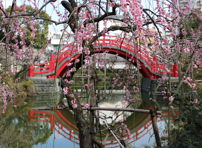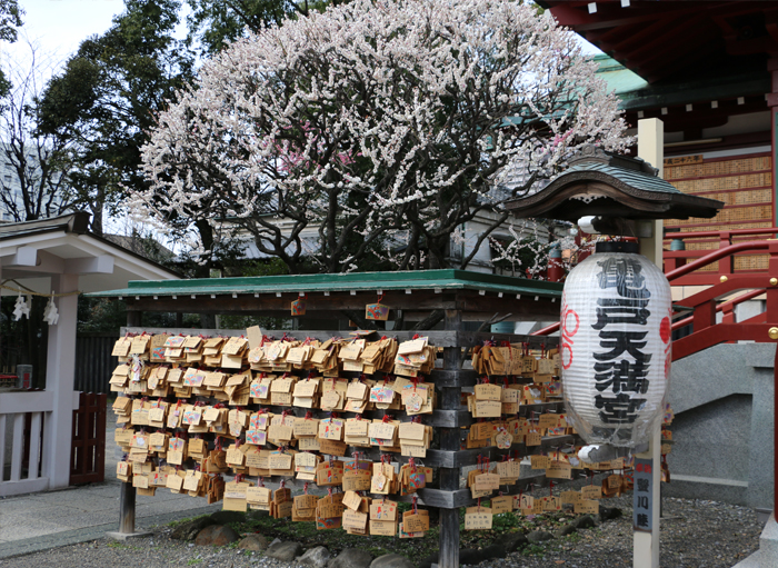 Located in the heart of Tokyo, Kameido Tenjin Shrine has been nicknamed "Shita-machi no Tenjin-sama," meaning the "Downtown Tenjin Shrine of Tokyo." Sugawara no Michizane is enshrined here, and the shrine is good luck in scholarship and studies. This shrine is famous for it's beautifully manicured wisteria trellises and 200 plum trees. The wisteria on the trellises bloom late April- early May and have been inspiration for many an ukiyo-e wood block print, especially in the Edo Period. During the wisteria season, the shrine holds the "Fuji-Festival," (wisteria festival). The Kameido Tenjin Shrine also features a gorgeous red arched drum-bridge over a pond filled with turtles and water fowl. If you visit during the wisteria season, make sure to check out the trellises and catch a glimpse of the reflection of the purple flowers on the pond.